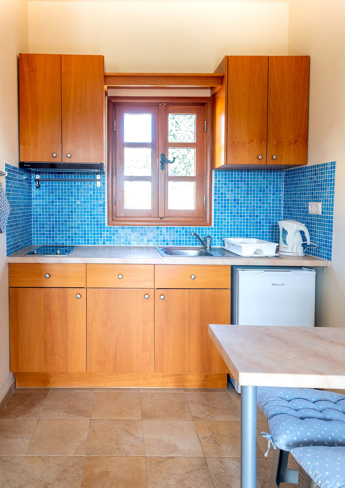 The studios have double beds and air-conditioned living/bedroom areas. We provide dish and hand towels. The kitchen area includes a cooker with twin hobs, a fridge with freezer compartment, and plenty of pots, pans, cutlery, crockery, and utensils.